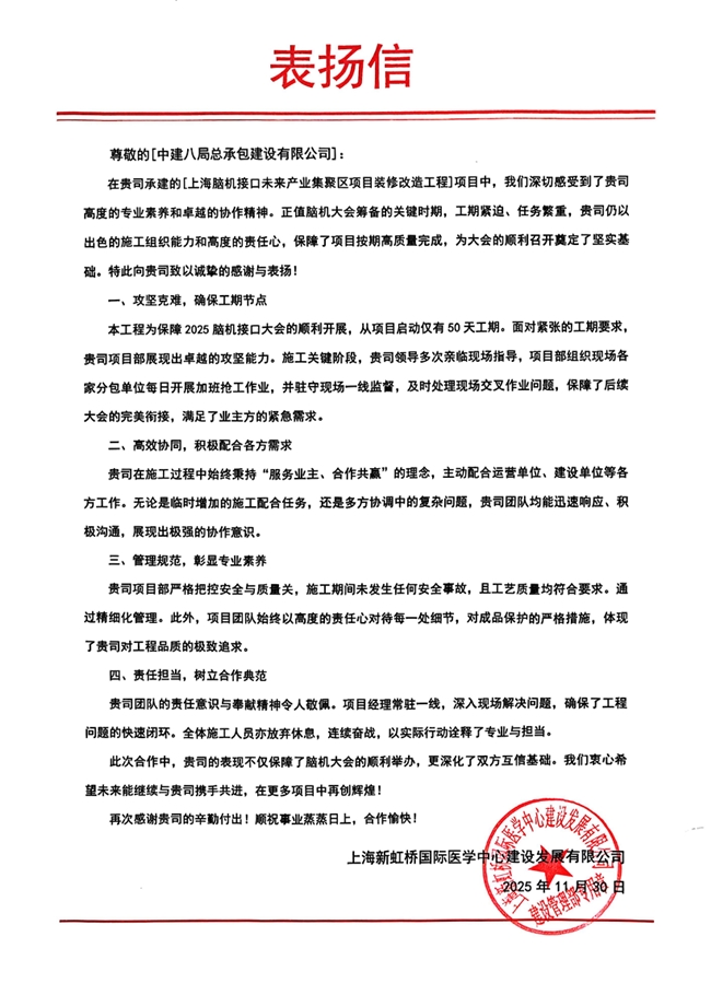中建八局总承包建设有限公司装饰分公司于近期收到上海新虹桥国际医学中心建设发展有限公司发来的表扬信,信中对其在上海脑机接口未来产业集聚区项目装修改造工程中的出色表现给予高度肯定。